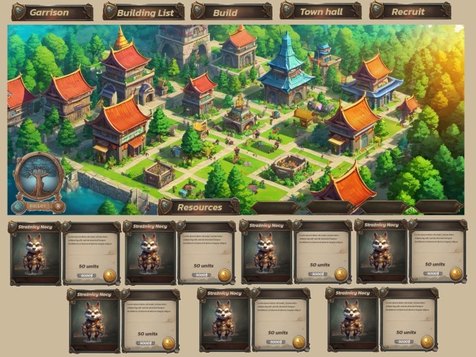 - Budynki rozwija się za pomocą zasobów (złoto, drewno, kamienie szlachetne, itp.).